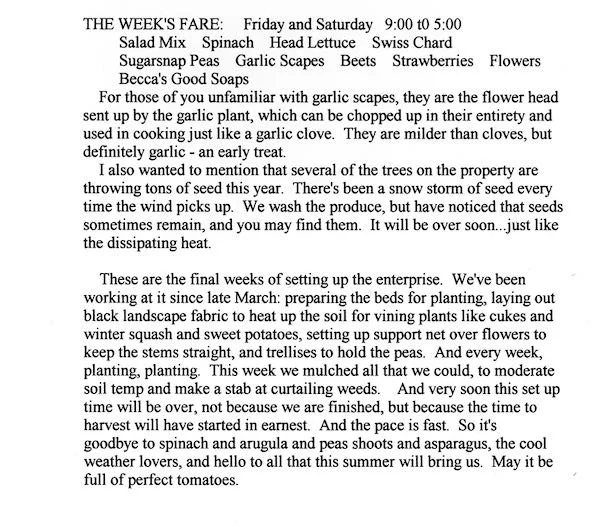 This post begins a reminiscence of my work as a gardener offering weekly produce at our farm stand in Old Chatham, NY in the summers between 2001 and 2012. Here you can find the week’s fare of produce, eggs and flowers. Some of you may remember these interchanges and others might find them interesting as well. These days, years ago, walking under the sun have so much informed my current art work.