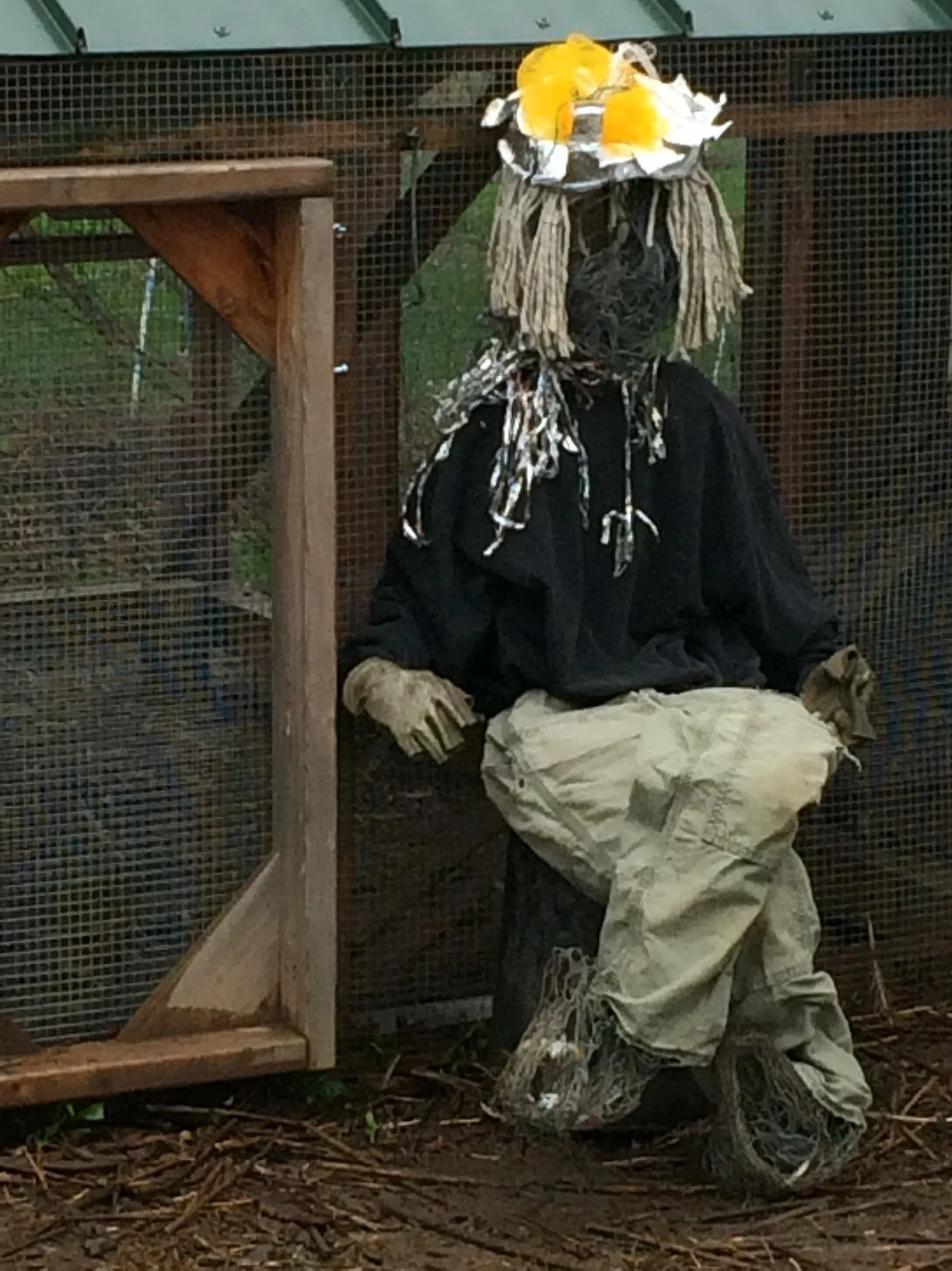 The above is a chicken wire scarecrow named Lavinia, who worked hard on the farm keeping birds out of the peaches or, here in the chicken run, keeping predator birds at bay. Face and feet show her visible structure. This handwork was from the distant past.