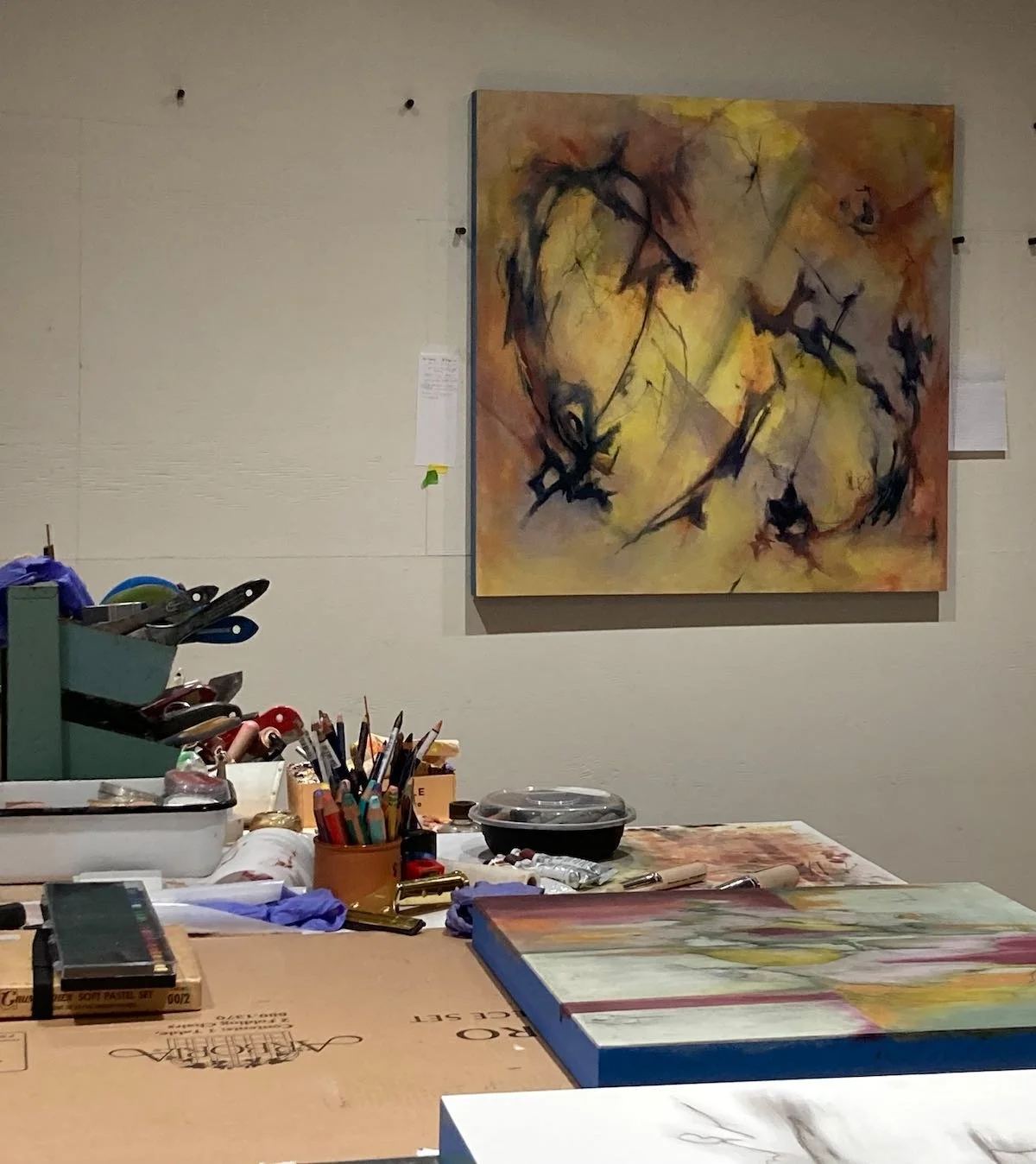 When I proceed, paint on panel, I tend to make random marks. I could have my eyes closed. I could be listening to the sound of charcoal on a wooden surface. The paint smell can be prominent. And anything can happen - which is usually called a mess.